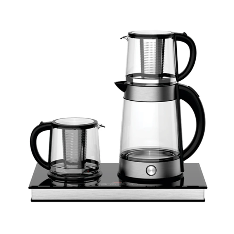 سایر توضیحات: توان: ۱۸۵۰-۲۲۰۰ وات ولتاژ: ۲۲۰-۲۴۰ ولت فرکانس: ۵۰/۶۰ هرتز ظرفیت: ۱.۷ لیتر (کتری پیرکس)، ۱.۰ لیتر (قوری شیشه ای) چراغ گرم نگهدارنده / جوش آور / تنظیم درجه حرارت برای قهوه ، چای و انواع دمنوش / بدنه استیل ضدزنگ ۳۰۴ / المنت گرمای استیل ضدزنگ ۳۰۴ / کتری ۳۶۰ درجه / فیلتر چای استیل ضدزنگ / صفحه گرم نگهدارنده قوری / سینی شیشه ای کنترل پنل لمسی دیجیتال / سیستم خاموشی خودکار در برابر خالی بودن کتری / ۲ قوری / عملکر دم آور